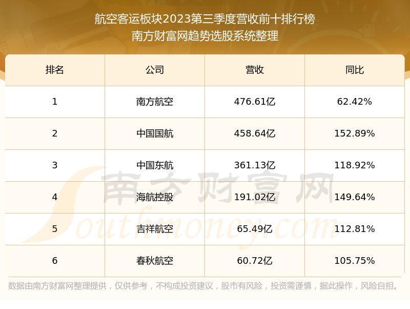 按照南方财富网趋势选股系统统计,该股所属板块为航空客运板块,该板块共有6只股票,春秋航空2023第三季度营收在该板块中排名为第6名,该板块2023第三季度营收排名前十的股票如下表: