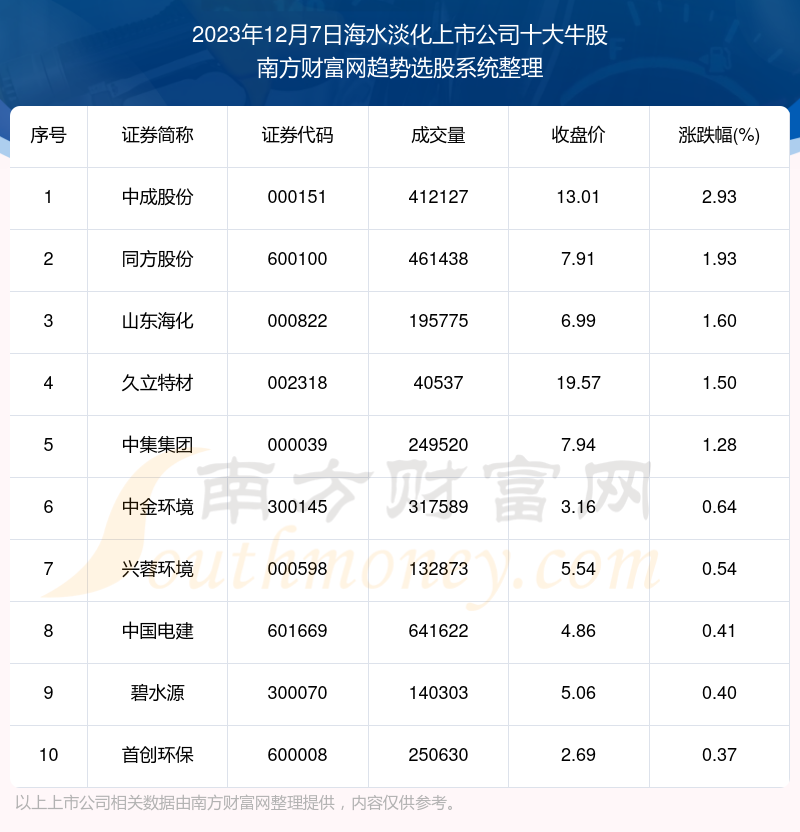 截止2023年12月7日,个股表现方面,海水淡化上市公司当日领涨股为中成股份(000151),该股当日报收13.01,上涨2.93%,成交量41.21万。同方股份(600100)以上涨1.93%紧随其后,该股当日成交量46.14万。此外,山东海化(000822)、久立特材(002318)、中集集团(000039)均进入当日海水淡化上市公司牛股之列。