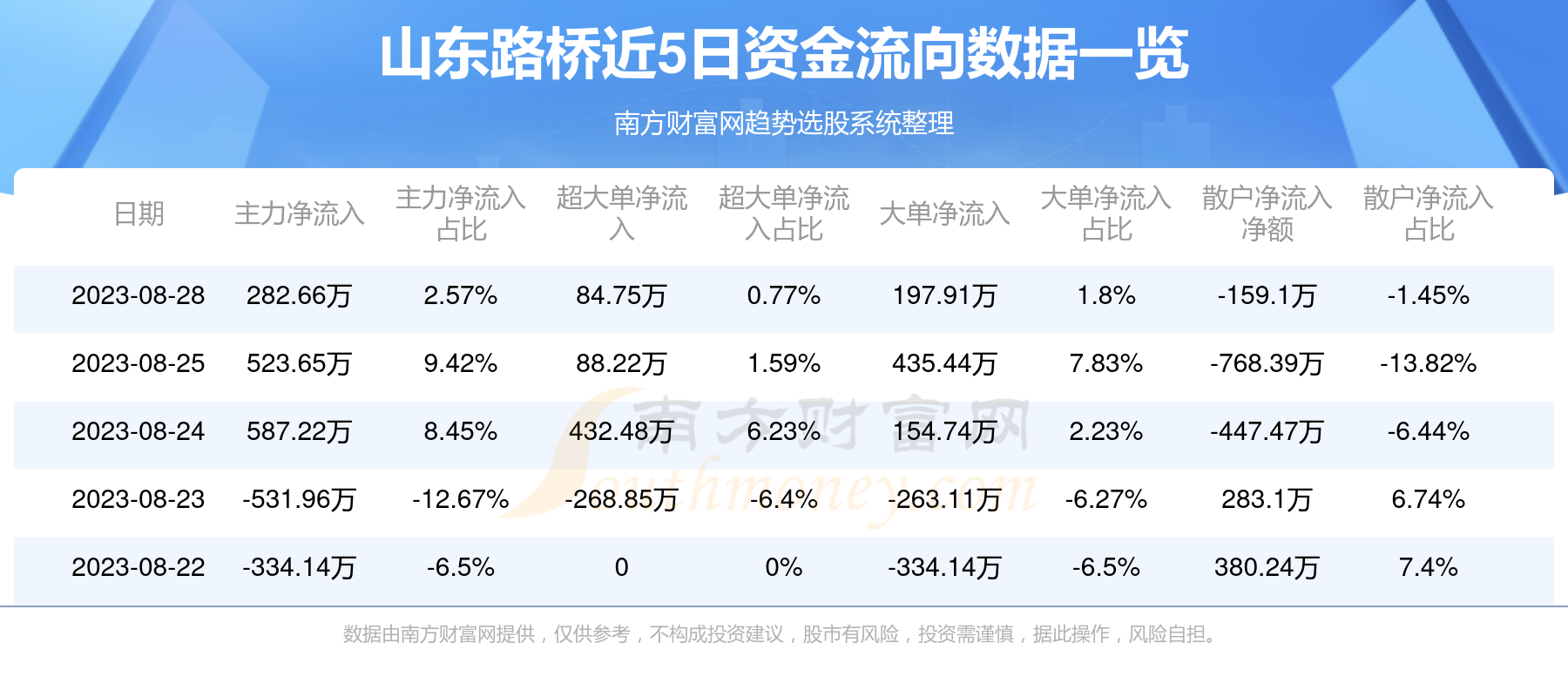 8月28日消息,山东路桥8月28日主力净流入282.66万元,超大单净流入84.75万元,大单净流入197.91万元,散户净流出159.1万元。