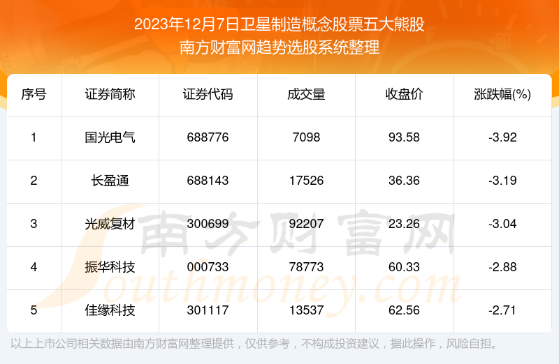 截止2023年12月7日,个股表现方面,卫星制造概念股票当日领跌股为国光电气(688776),该股当日报收93.58,上涨-3.92%,成交量0.71万。长盈通(688143)以下跌-3.19%紧随其后,该股当日成交量1.75万。此外,光威复材(300699)、振华科技(000733)、佳缘科技(301117)均进入当日卫星制造概念股票熊股之列。