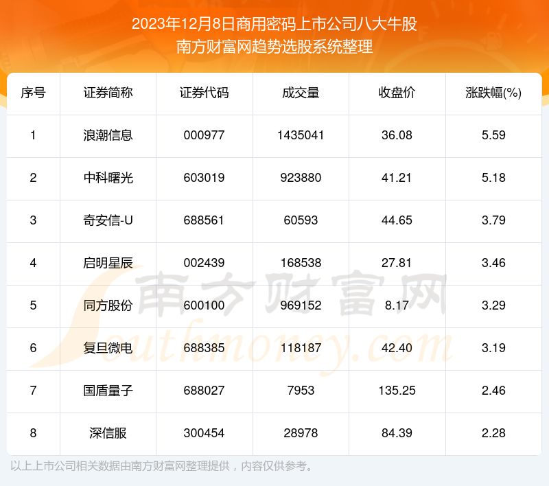 截止2023年12月8日,个股表现方面,商用密码上市公司当日领涨股为浪潮信息(000977),该股当日报收36.08,上涨5.59%,成交量143.5万。中科曙光(603019)以上涨5.18%紧随其后,该股当日成交量92.39万。此外,奇安信-U(688561)、启明星辰(002439)、同方股份(600100)均进入当日商用密码上市公司牛股之列。