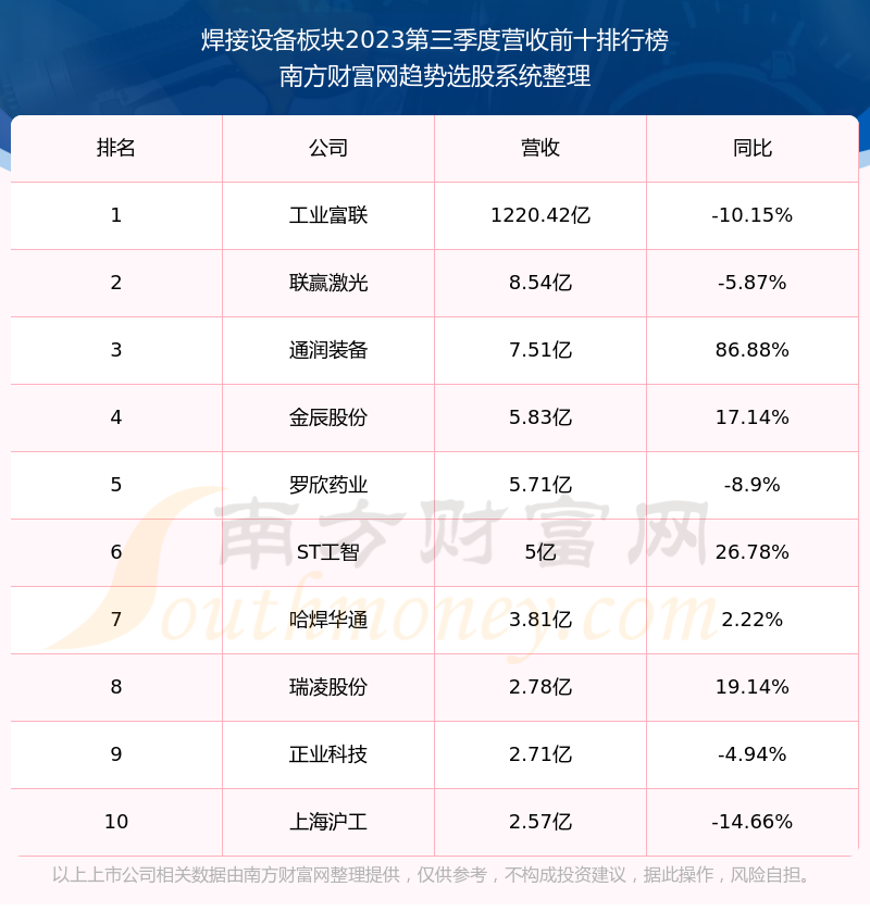 按照南方财富网趋势选股系统统计,该股所属板块为焊接设备板块,该板块共有11只股票,骄成超声2023第三季度营收在该板块中排名为第11名,该板块2023第三季度营收排名前十的股票如下表: