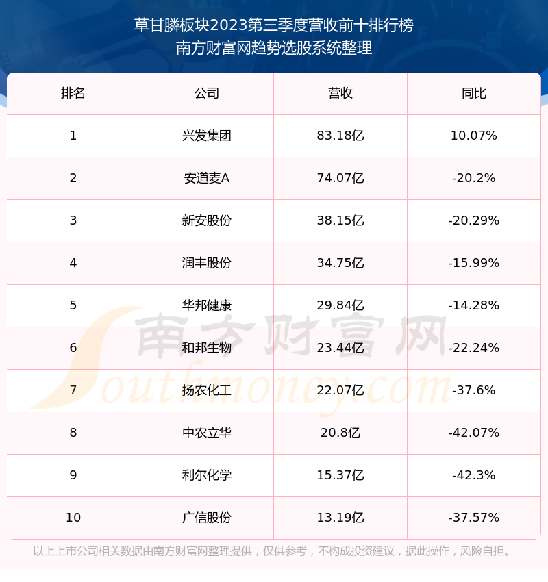按照南方财富网趋势选股系统统计,该股所属板块为草甘膦板块,该板块共有21只股票,和邦生物2023第三季度营收在该板块中排名为第6名,该板块2023第三季度营收排名前十的股票如下表: