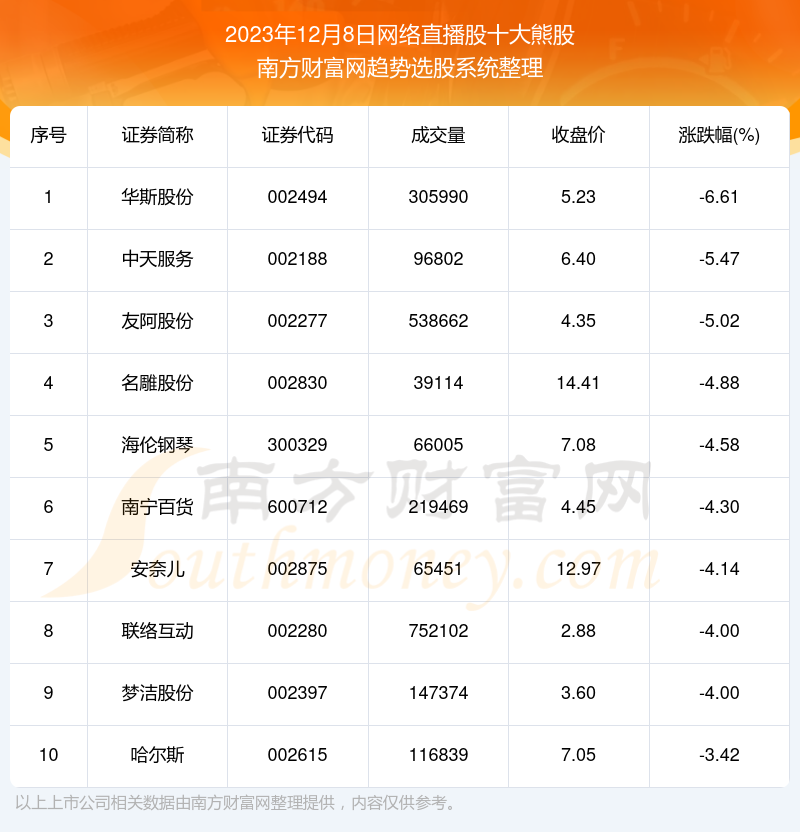 截止2023年12月8日,个股表现方面,网络直播股当日领跌股为华斯股份(002494),该股当日报收5.23,上涨-6.61%,成交量30.6万。中天服务(002188)以下跌-5.47%紧随其后,该股当日成交量9.68万。此外,友阿股份(002277)、名雕股份(002830)、海伦钢琴(300329)均进入当日网络直播股熊股之列。