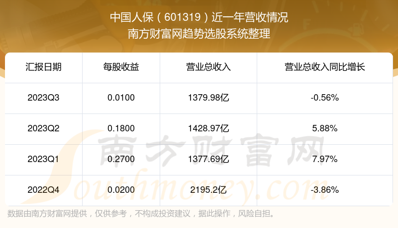 中国人保2023年第三季度显示,公司主营收入1379.98亿元,同比-0.56%;归母净利润6.22亿元,同比-89.57%;扣非净利润6.05亿元,同比-89.6%。