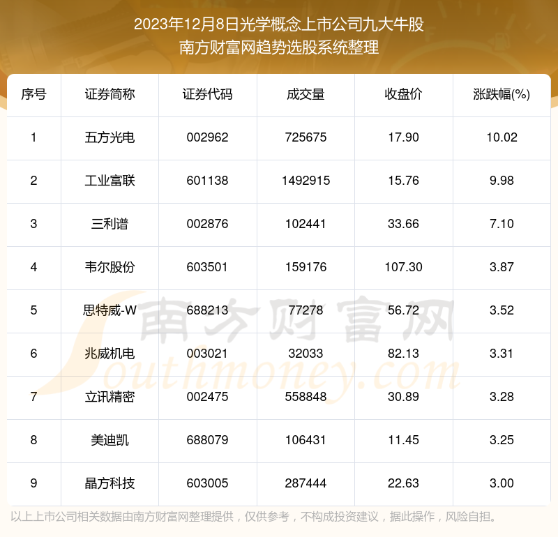 截止2023年12月8日,个股表现方面,光学概念上市公司当日领涨股为五方光电(002962),该股当日报收17.90,上涨10.02%,成交量72.57万。工业富联(601138)以上涨9.98%紧随其后,该股当日成交量149.29万。此外,三利谱(002876)、韦尔股份(603501)、思特威-W(688213)均进入当日光学概念上市公司牛股之列。