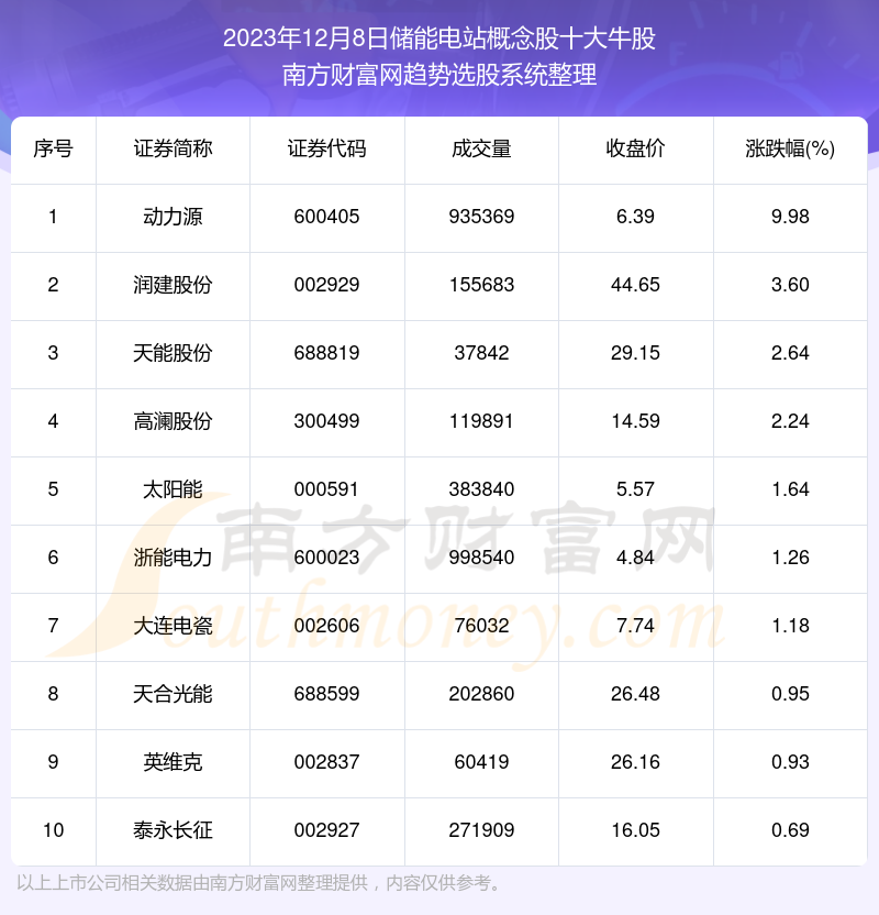 截止2023年12月8日,个股表现方面,储能电站概念股当日领涨股为动力源(600405),该股当日报收6.39,上涨9.98%,成交量93.54万。润建股份(002929)以上涨3.60%紧随其后,该股当日成交量15.57万。此外,天能股份(688819)、高澜股份(300499)、太阳能(000591)均进入当日储能电站概念股牛股之列。