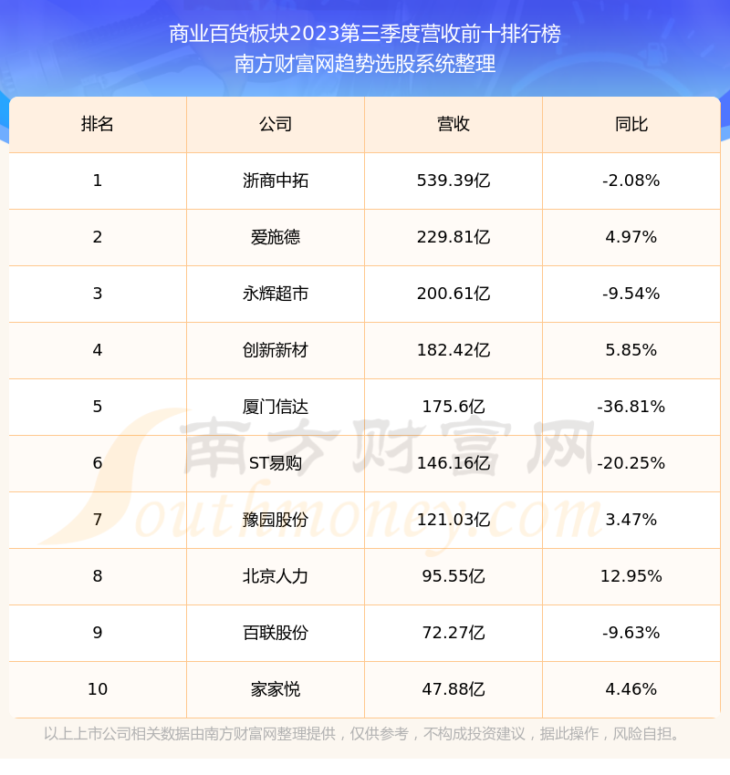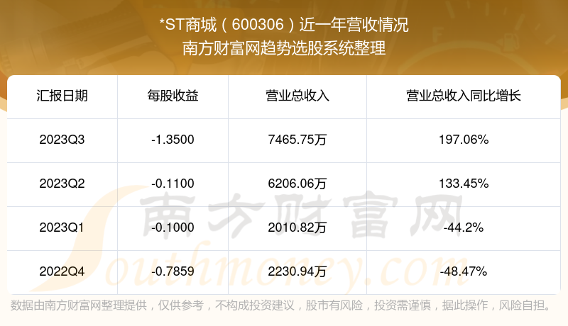 按照南方财富网趋势选股系统统计,该股所属板块为商业百货板块,该板块共有75只股票,*ST商城2023第三季度营收在该板块中排名为第70名,该板块2023第三季度营收排名前十的股票如下表: