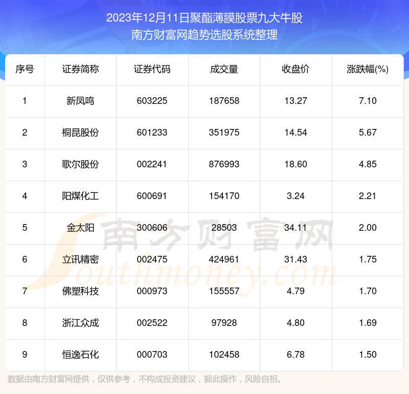 截止2023年12月11日,个股表现方面,聚酯薄膜股票当日领涨股为新凤鸣(603225),该股当日报收13.27,上涨7.10%,成交量18.77万。桐昆股份(601233)以上涨5.67%紧随其后,该股当日成交量35.2万。此外,歌尔股份(002241)、阳煤化工(600691)、金太阳(300606)均进入当日聚酯薄膜股票牛股之列。