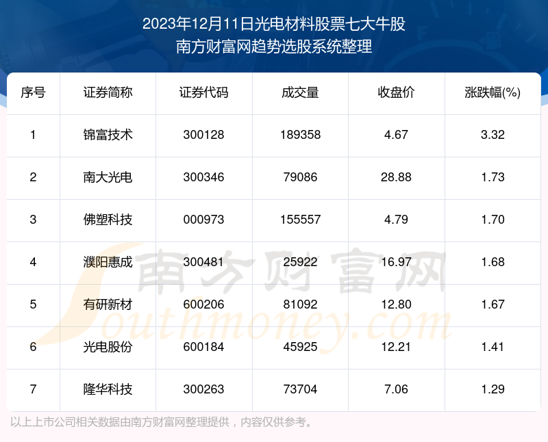 截止2023年12月11日,个股表现方面,光电材料股票当日领涨股为锦富技术(300128),该股当日报收4.67,上涨3.32%,成交量18.94万。南大光电(300346)以上涨1.73%紧随其后,该股当日成交量7.91万。此外,佛塑科技(000973)、濮阳惠成(300481)、有研新材(600206)均进入当日光电材料股票牛股之列。