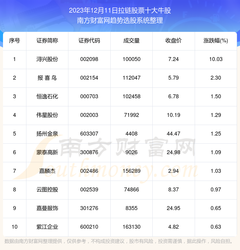 截止2023年12月11日,个股表现方面,拉链股票当日领涨股为浔兴股份(002098),该股当日报收7.24,上涨10.03%,成交量10.01万。报 喜 鸟(002154)以上涨2.30%紧随其后,该股当日成交量11.2万。此外,恒逸石化(000703)、伟星股份(002003)、扬州金泉(603307)均进入当日拉链股票牛股之列。
