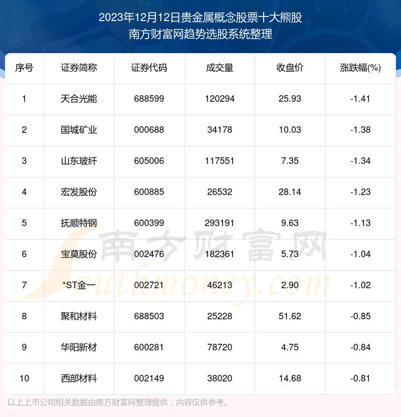 截止2023年12月12日,个股表现方面,贵金属概念股票当日领跌股为天合光能(688599),该股当日报收25.93,上涨-1.41%,成交量12.03万。国城矿业(000688)以下跌-1.38%紧随其后,该股当日成交量3.42万。此外,山东玻纤(605006)、宏发股份(600885)、抚顺特钢(600399)均进入当日贵金属概念股票熊股之列。