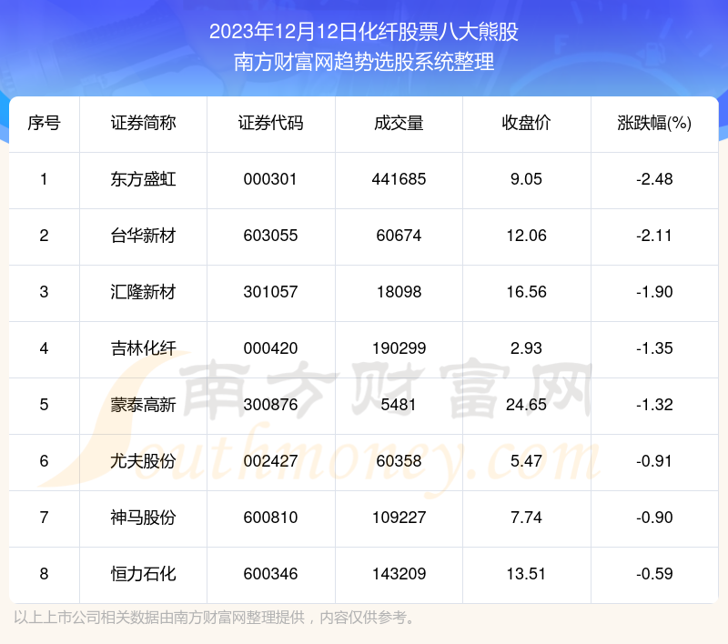 截止2023年12月12日,个股表现方面,化纤股票当日领跌股为东方盛虹(000301),该股当日报收9.05,上涨-2.48%,成交量44.17万。台华新材(603055)以下跌-2.11%紧随其后,该股当日成交量6.07万。此外,汇隆新材(301057)、吉林化纤(000420)、蒙泰高新(300876)均进入当日化纤股票熊股之列。