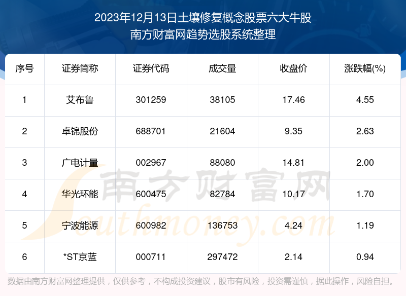 截止2023年12月13日,个股表现方面,土壤修复概念股票当日领涨股为艾布鲁(301259),该股当日报收17.46,上涨4.55%,成交量3.81万。卓锦股份(688701)以上涨2.63%紧随其后,该股当日成交量2.16万。此外,广电计量(002967)、华光环能(600475)、宁波能源(600982)均进入当日土壤修复概念股票牛股之列。