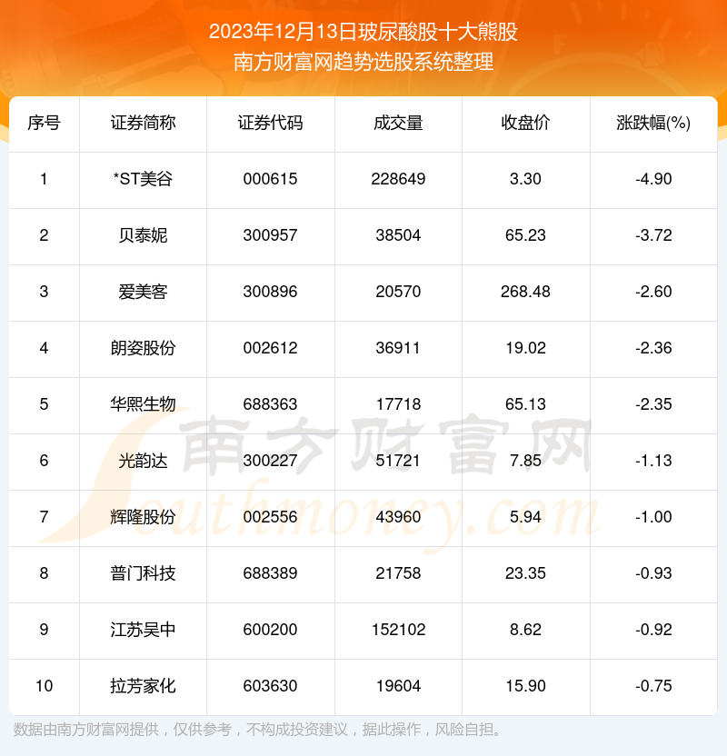 截止2023年12月13日,个股表现方面,玻尿酸股当日领跌股为*ST美谷(000615),该股当日报收3.30,上涨-4.90%,成交量22.86万。贝泰妮(300957)以下跌-3.72%紧随其后,该股当日成交量3.85万。此外,爱美客(300896)、朗姿股份(002612)、华熙生物(688363)均进入当日玻尿酸股熊股之列。