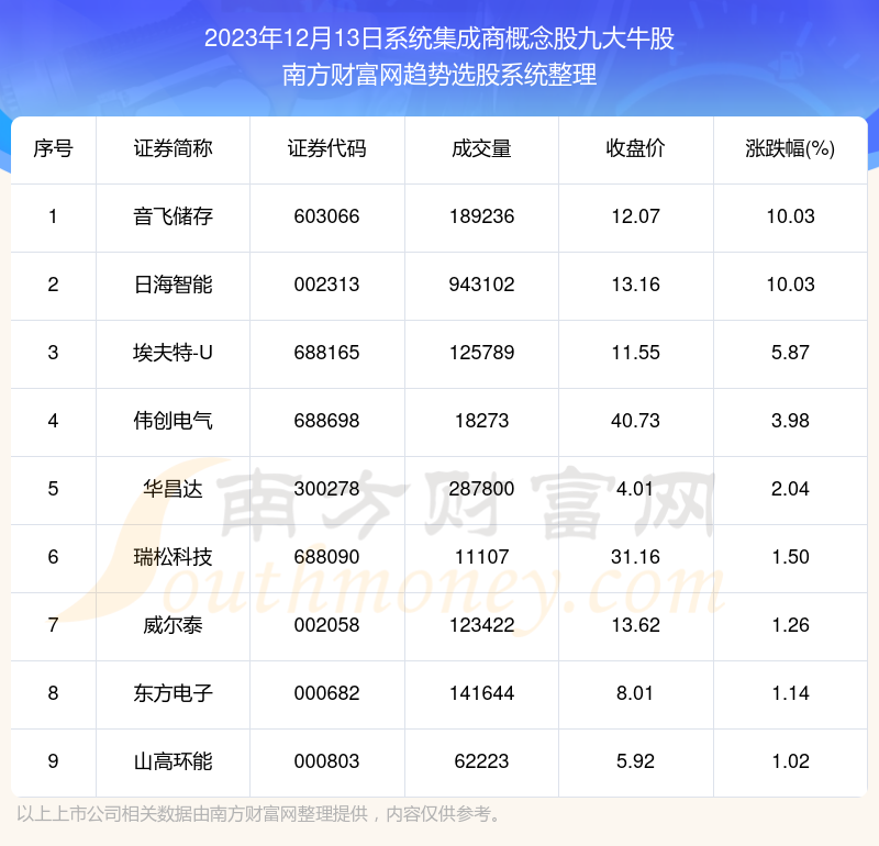 截止2023年12月13日,个股表现方面,系统集成商概念股当日领涨股为音飞储存(603066),该股当日报收12.07,上涨10.03%,成交量18.92万。日海智能(002313)以上涨10.03%紧随其后,该股当日成交量94.31万。此外,埃夫特-U(688165)、伟创电气(688698)、华昌达(300278)均进入当日系统集成商概念股牛股之列。