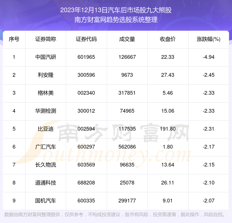截止2023年12月13日,个股表现方面,汽车后市场股当日领跌股为中国汽研(601965),该股当日报收22.33,上涨-4.94%,成交量12.67万。利安隆(300596)以下跌-2.45%紧随其后,该股当日成交量0.97万。此外,格林美(002340)、华测检测(300012)、比亚迪(002594)均进入当日汽车后市场股熊股之列。