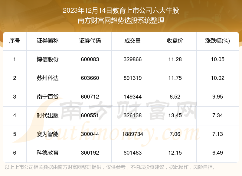 截止2023年12月14日,个股表现方面,教育上市公司当日领涨股为博信股份(600083),该股当日报收11.28,上涨10.05%,成交量32.99万。苏州科达(603660)以上涨10.02%紧随其后,该股当日成交量89.13万。此外,南宁百货(600712)、时代出版(600551)、赛为智能(300044)均进入当日教育上市公司牛股之列。