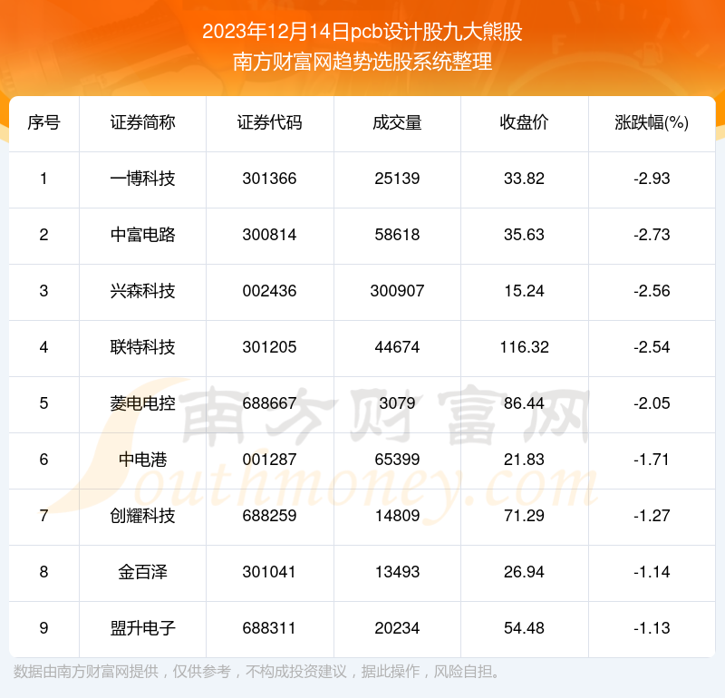 截止2023年12月14日,个股表现方面,pcb设计股当日领跌股为一博科技(301366),该股当日报收33.82,上涨-2.93%,成交量2.51万。中富电路(300814)以下跌-2.73%紧随其后,该股当日成交量5.86万。此外,兴森科技(002436)、联特科技(301205)、菱电电控(688667)均进入当日pcb设计股熊股之列。