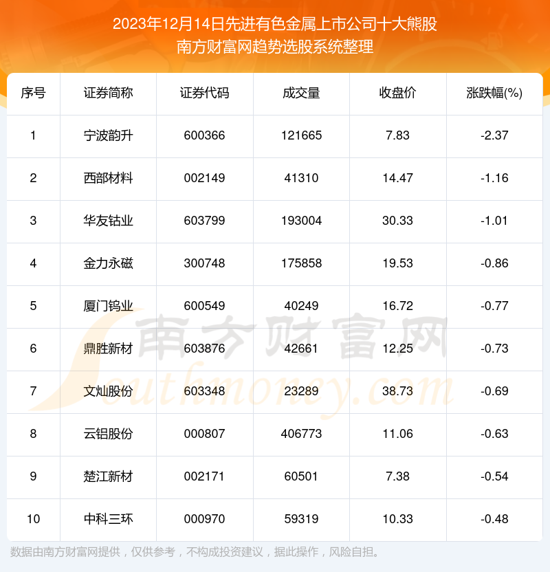 以上就是网络对配资软件 数据解盘|2023年12月14日先进有色金属上市公司十大熊股一览的解读(https://www.youge168.com/news-pzhq/52152.html)希望可以帮助您。