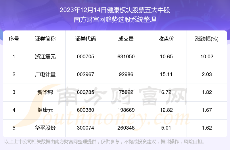 截止2023年12月14日,个股表现方面,健康板块股票当日领涨股为浙江震元(000705),该股当日报收10.65,上涨10.02%,成交量63.11万。广电计量(002967)以上涨2.03%紧随其后,该股当日成交量9.3万。此外,新华锦(600735)、健康元(600380)、华平股份(300074)均进入当日健康板块股票牛股之列。