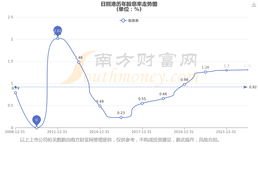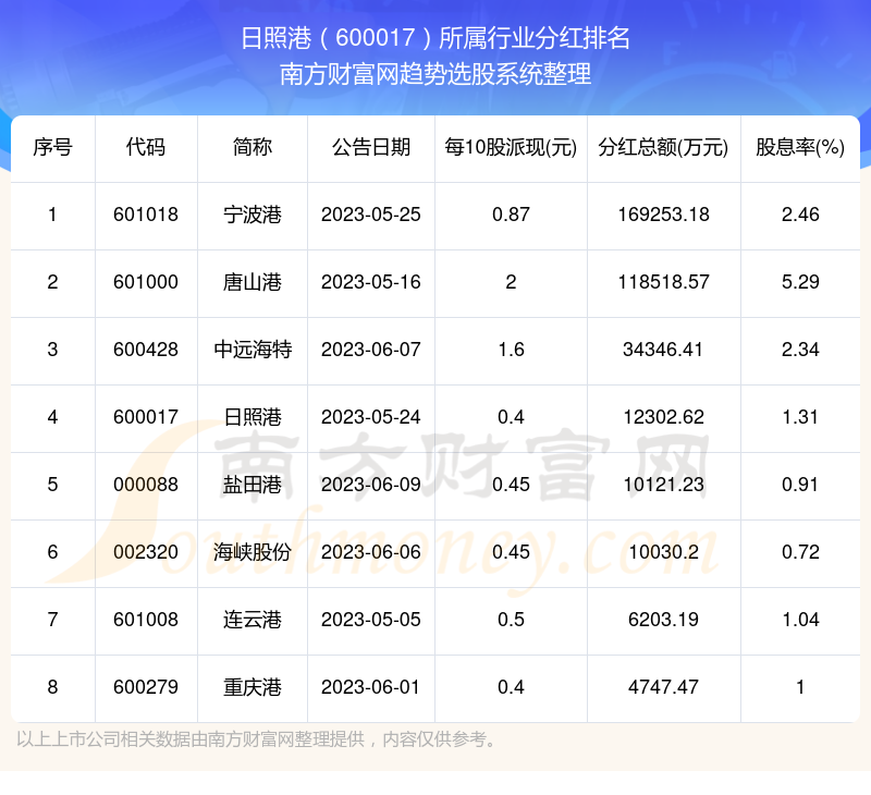 按照南方财富网趋势选股系统统计,日照港所属行业为航运港口行业,航运港口行业分红排名情况如下表:
