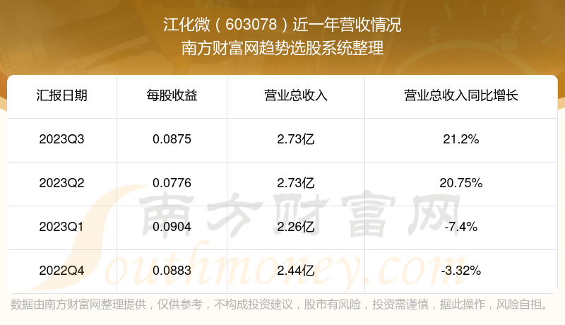 财报显示,2023年第三季度江化微营收2.73亿元,同比增长21.2%,净利润3374.6万元,同比增长66.19%。