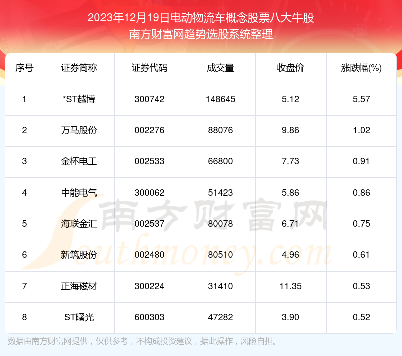 截止2023年12月19日,个股表现方面,电动物流车概念股票当日领涨股为*ST越博(300742),该股当日报收5.12,上涨5.57%,成交量14.86万。万马股份(002276)以上涨1.02%紧随其后,该股当日成交量8.81万。此外,金杯电工(002533)、中能电气(300062)、海联金汇(002537)均进入当日电动物流车概念股票牛股之列。