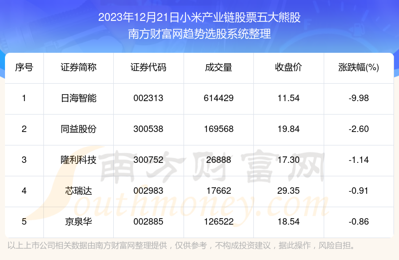 截止2023年12月21日,个股表现方面,小米产业链股票当日领跌股为日海智能(002313),该股当日报收11.54,上涨-9.98%,成交量61.44万。同益股份(300538)以下跌-2.60%紧随其后,该股当日成交量16.96万。此外,隆利科技(300752)、芯瑞达(002983)、京泉华(002885)均进入当日小米产业链股票熊股之列。