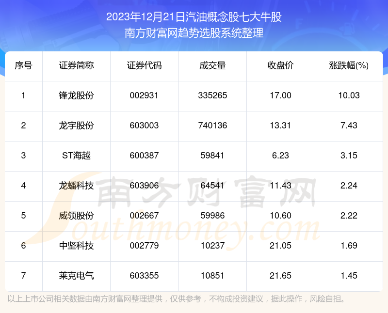 截止2023年12月21日,个股表现方面,汽油概念股当日领涨股为锋龙股份(002931),该股当日报收17.00,上涨10.03%,成交量33.53万。龙宇股份(603003)以上涨7.43%紧随其后,该股当日成交量74.01万。此外,ST海越(600387)、龙蟠科技(603906)、威领股份(002667)均进入当日汽油概念股牛股之列。