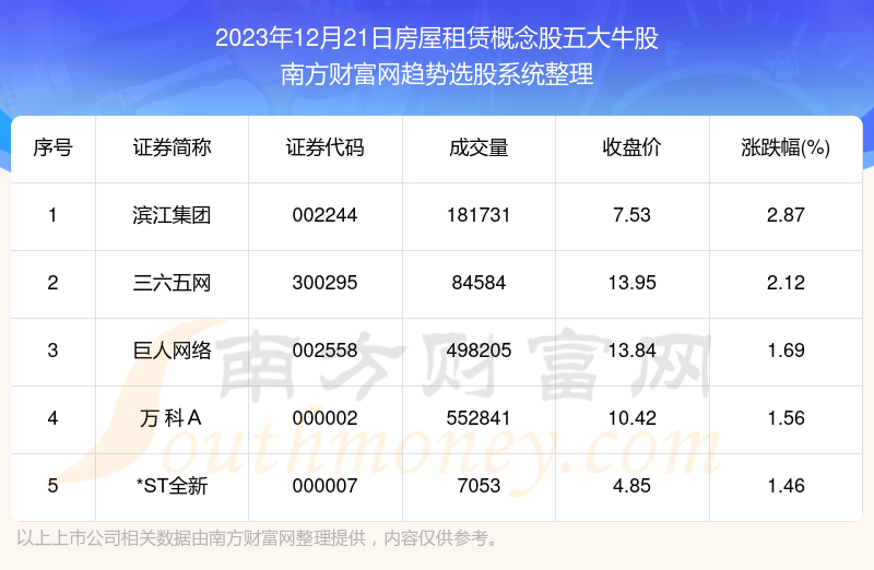 截止2023年12月21日,个股表现方面,房屋租赁概念股当日领涨股为滨江集团(002244),该股当日报收7.53,上涨2.87%,成交量18.17万。三六五网(300295)以上涨2.12%紧随其后,该股当日成交量8.46万。此外,巨人网络(002558)、万 科A(000002)、*ST全新(000007)均进入当日房屋租赁概念股牛股之列。