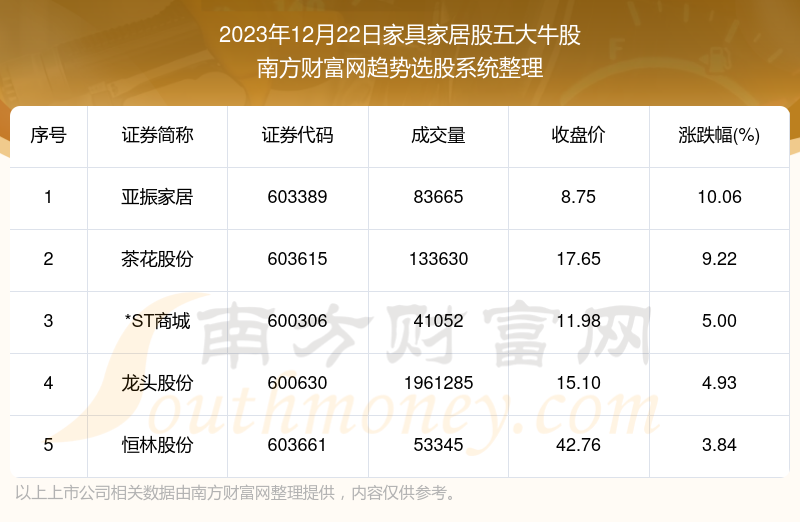 截止2023年12月22日,个股表现方面,家具家居股当日领涨股为亚振家居(603389),该股当日报收8.75,上涨10.06%,成交量8.37万。茶花股份(603615)以上涨9.22%紧随其后,该股当日成交量13.36万。此外,*ST商城(600306)、龙头股份(600630)、恒林股份(603661)均进入当日家具家居股牛股之列。