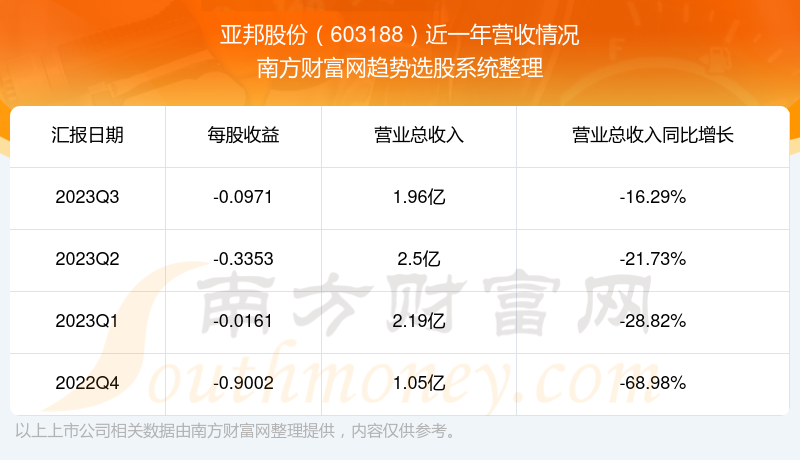 亚邦股份股票近一年营收情况如下表: