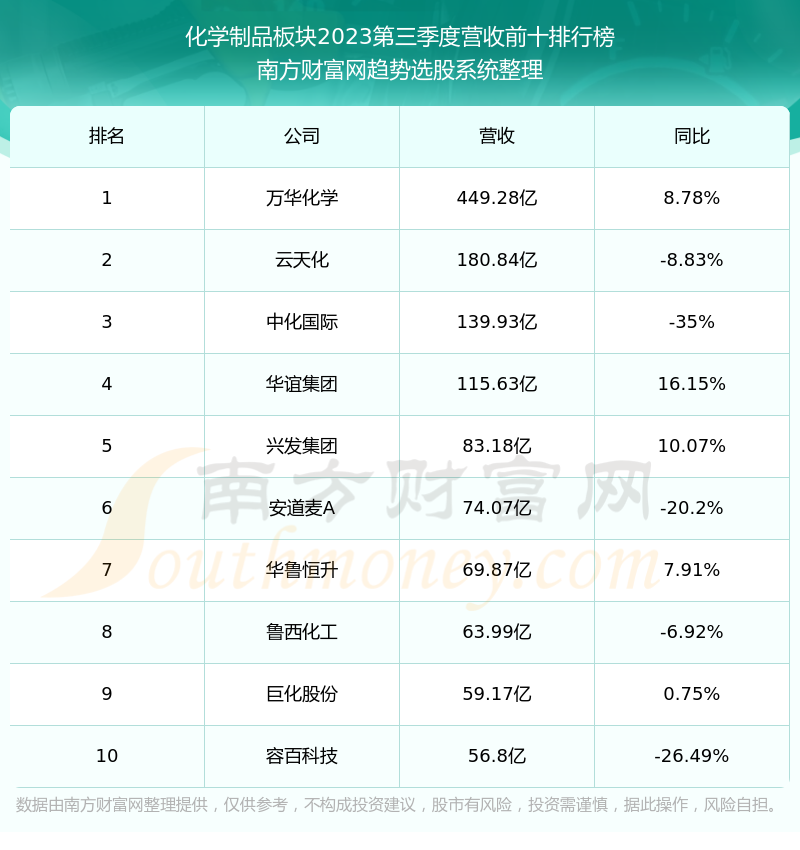 按照南方财富网趋势选股系统统计,该股所属板块为化学制品板块,该板块共有136只股票,亚邦股份2023第三季度营收在该板块中排名为第109名,该板块2023第三季度营收排名前十的股票如下表: