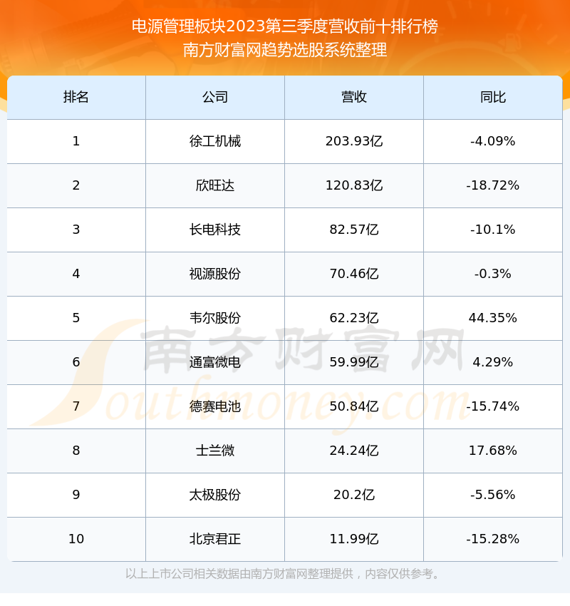 按照南方财富网趋势选股系统统计,该股所属板块为电源管理板块,该板块共有32只股票,力芯微2023第三季度营收在该板块中排名为第32名,该板块2023第三季度营收排名前十的股票如下表:
