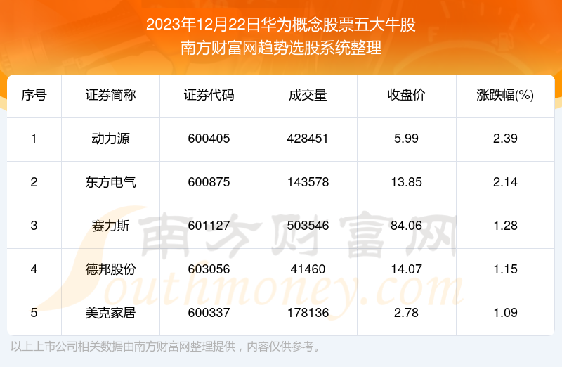 截止2023年12月22日,个股表现方面,华为概念股票当日领涨股为动力源(600405),该股当日报收5.99,上涨2.39%,成交量42.85万。东方电气(600875)以上涨2.14%紧随其后,该股当日成交量14.36万。此外,赛力斯(601127)、德邦股份(603056)、美克家居(600337)均进入当日华为概念股票牛股之列。