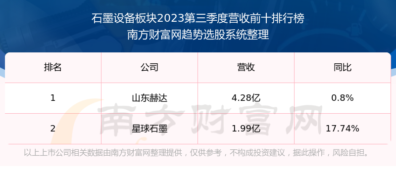 按照南方财富网趋势选股系统统计,该股所属板块为石墨设备板块,该板块共有2只股票,星球石墨2023第三季度营收在该板块中排名为第2名,该板块2023第三季度营收排名前十的股票如下表: