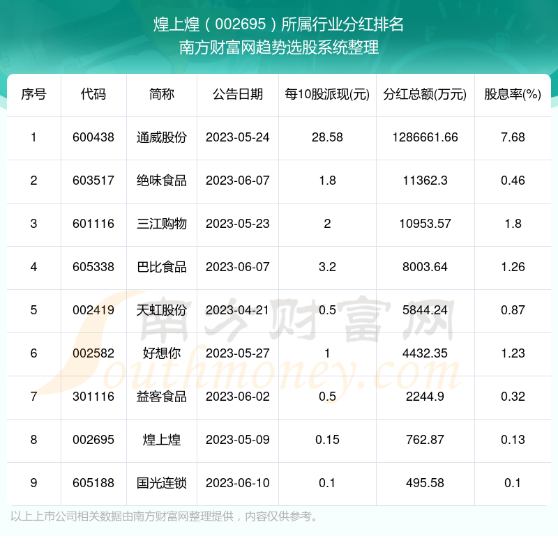按照南方财富网趋势选股系统统计,煌上煌所属行业为食品行业,食品行业分红排名情况如下表: