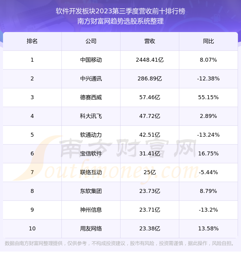 按照南方财富网趋势选股系统统计,该股所属板块为软件开发板块,该板块共有195只股票,格尔软件2023第三季度营收在该板块中排名为第115名,该板块2023第三季度营收排名前十的股票如下表: