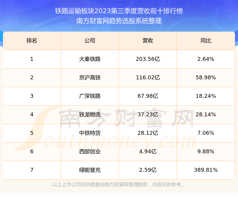 按照南方财富网趋势选股系统统计,该股所属板块为铁路运输板块,该板块共有7只股票,京沪高铁2023第三季度营收在该板块中排名为第2名,该板块2023第三季度营收排名前十的股票如下表: