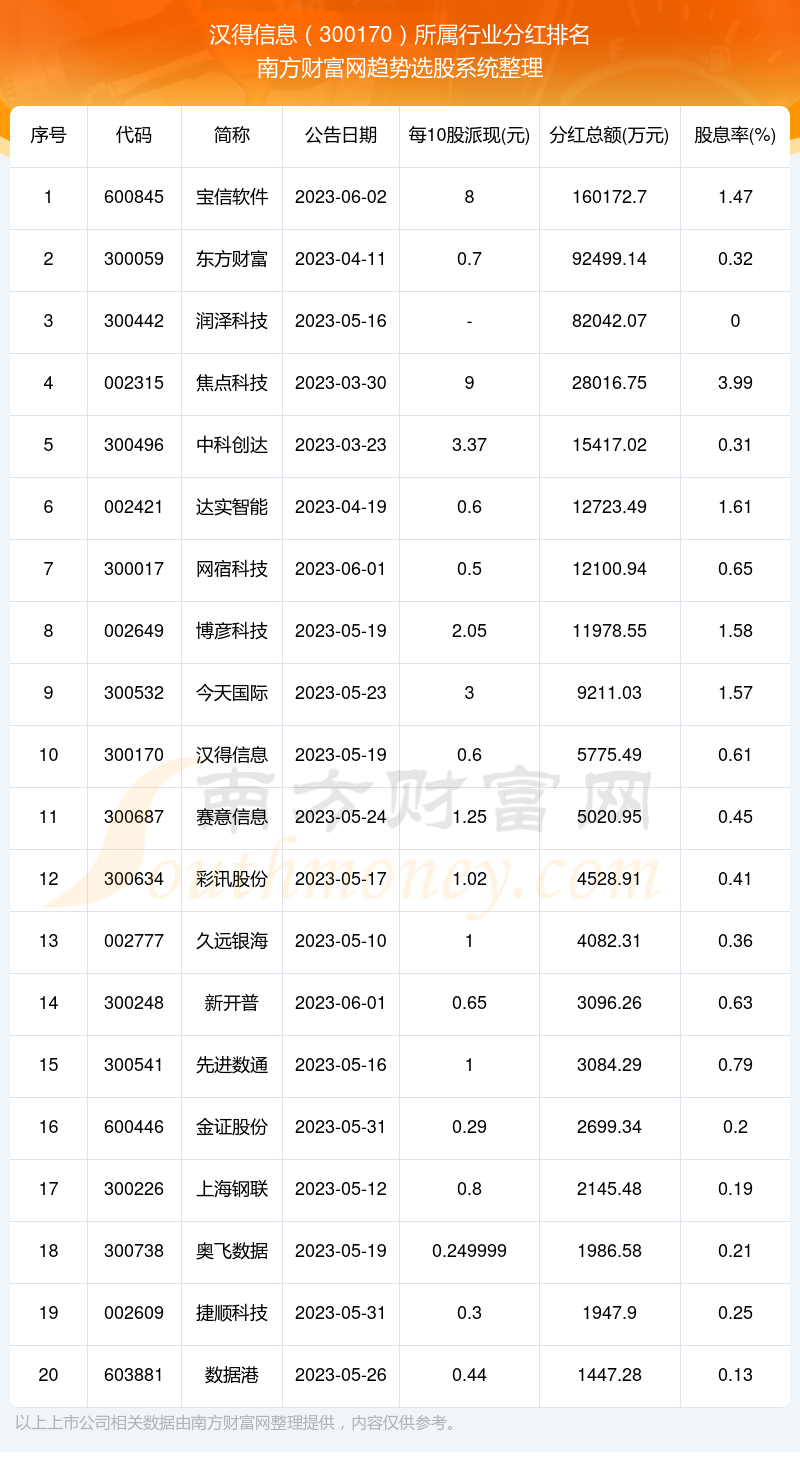 按照南方财富网趋势选股系统统计,汉得信息所属行业为ERP行业,ERP行业分红排名情况如下表: