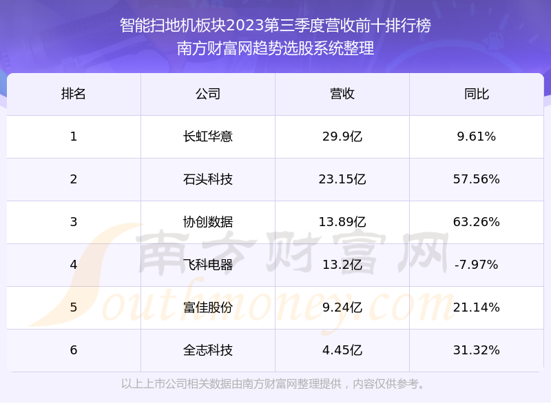 按照南方财富网趋势选股系统统计,该股所属板块为智能扫地机板块,该板块共有6只股票,石头科技2023第三季度营收在该板块中排名为第2名,该板块2023第三季度营收排名前十的股票如下表: