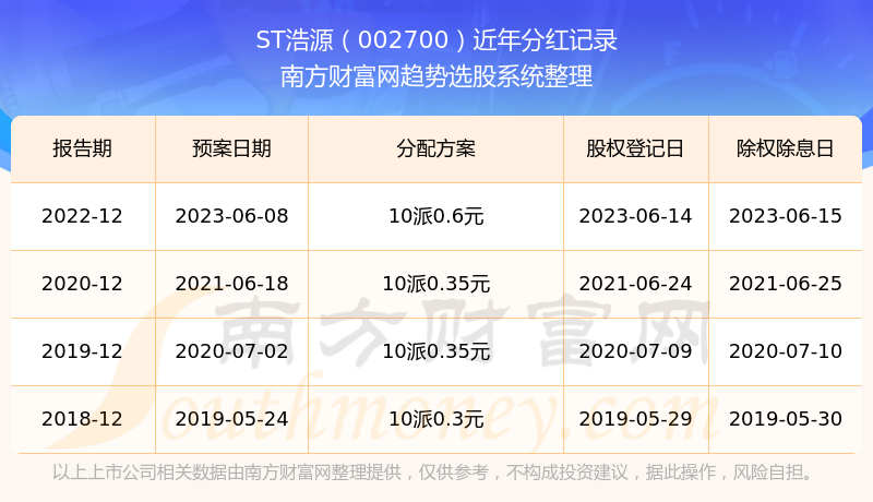 ST浩源最新一次公布的分红方案为10派0.6元。本次权益分派股权登记日为2023年6月14日,除权除息日为2023年6月15日,派息日为2023年6月15日。