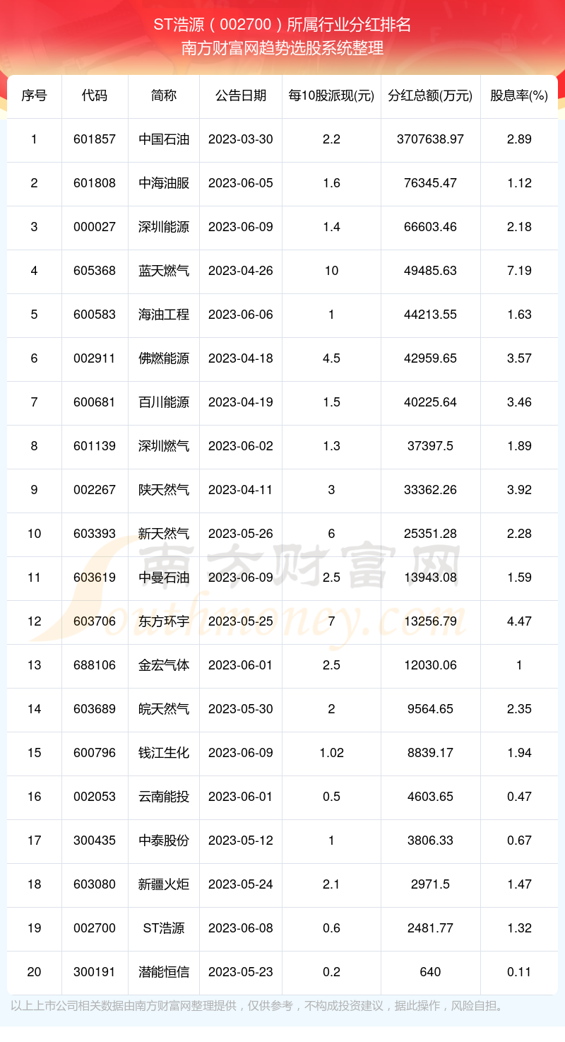 按照南方财富网趋势选股系统统计,ST浩源所属行业为天然气行业,天然气行业分红排名情况如下表: