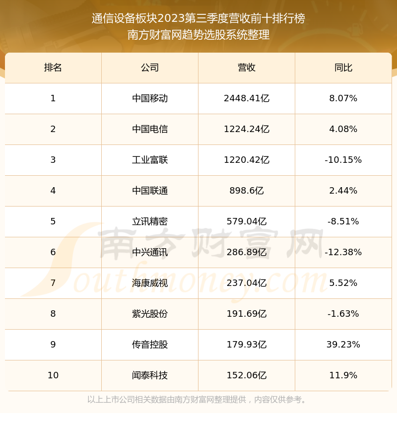按照南方财富网趋势选股系统统计,该股所属板块为通信设备板块,该板块共有140只股票,永鼎股份2023第三季度营收在该板块中排名为第40名,该板块2023第三季度营收排名前十的股票如下表: