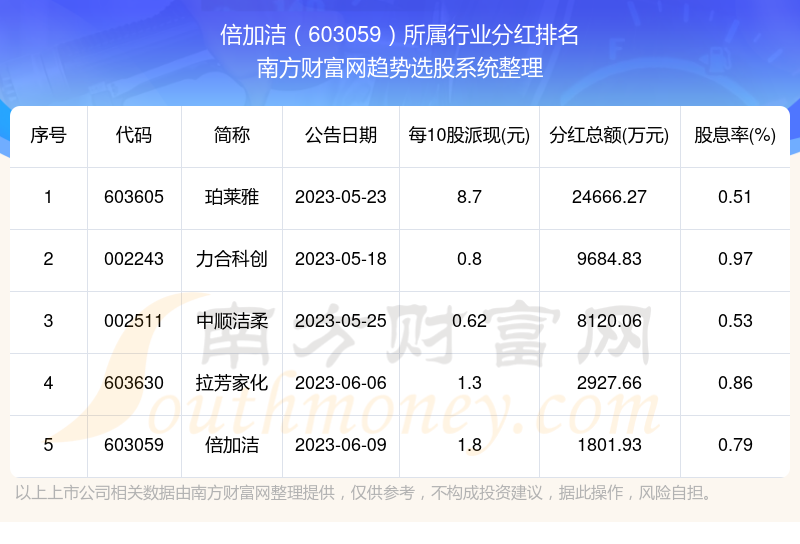 按照南方财富网趋势选股系统统计,倍加洁所属行业为牙刷行业,牙刷行业分红排名情况如下表: