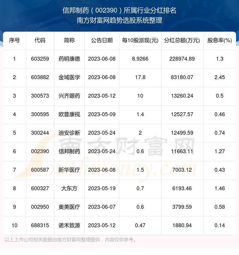 按照南方财富网趋势选股系统统计,信邦制药所属行业为中药行业,中药行业分红排名情况如下表: