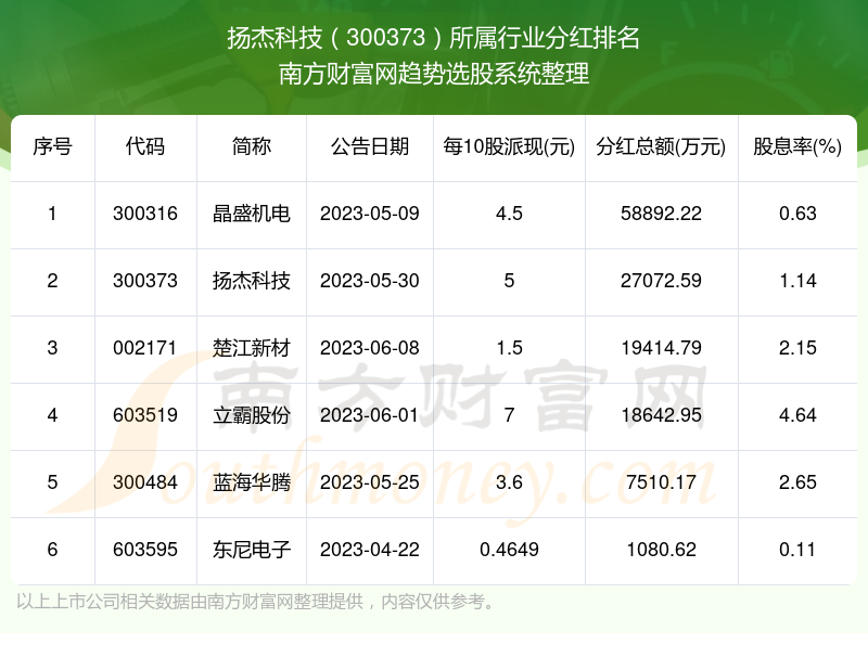 二、扬杰科技300373行业分红排名
