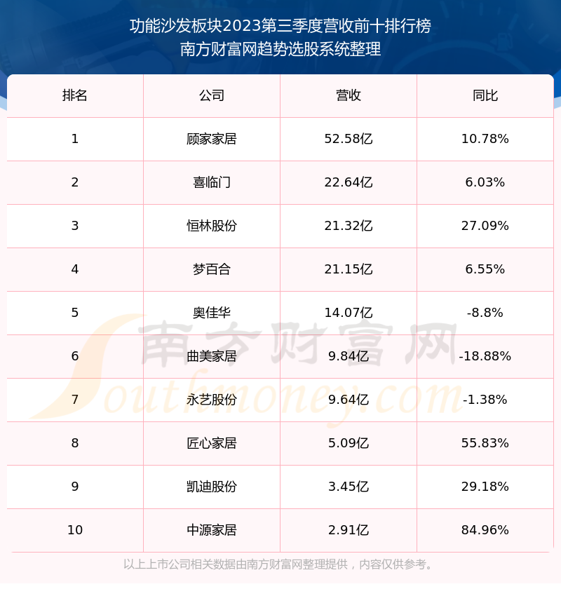 按照南方财富网趋势选股系统统计,该股所属板块为功能沙发板块,该板块共有11只股票,中源家居2023第三季度营收在该板块中排名为第10名,该板块2023第三季度营收排名前十的股票如下表: