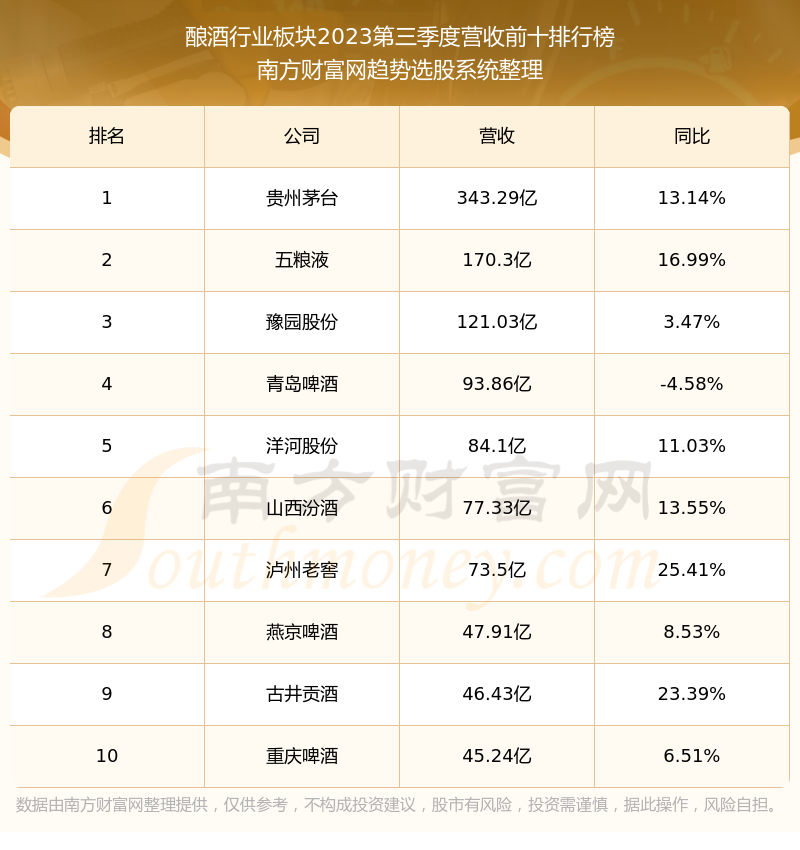 按照南方财富网趋势选股系统统计,该股所属板块为酿酒行业板块,该板块共有42只股票,贵州茅台2023第三季度营收在该板块中排名为第1名,该板块2023第三季度营收排名前十的股票如下表: